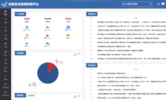 數據大屏是一款基于大屏的綜合性輿情數據分析系統,通過(guò)豐富的可視化窗口展現輿情走勢以及重點(diǎn)事件專(zhuān)項分析結果,多用于輿情會(huì )商和輔助決策。